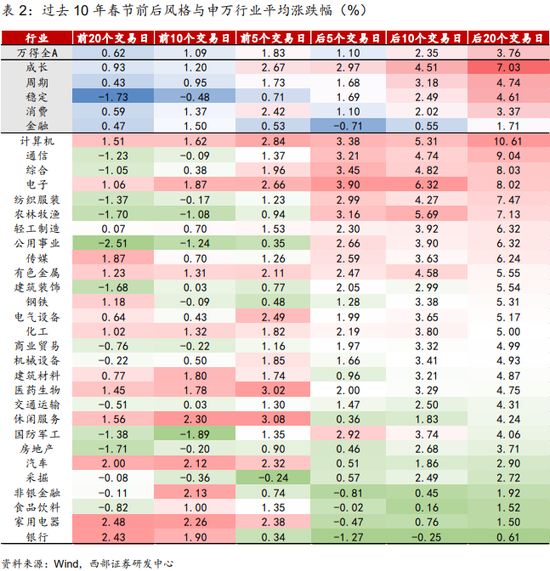 行业层面来看,节前可选消费与金融表现亮眼,节后必须消费与TMT开始占优。节前20个交易日内涨幅较高的行业主要为家用电器(2.48%)、银行(2.43%)与汽车(2.00%),节前5个交易日内涨幅领先的行业为休闲服务(3.08%)、医药生物(3.02%)与计算机(2.84%)。春节后原先居前的银行与家用电器开始走弱,而TMT板块中的计算机、通信和电子显著上涨,节后20个交易日内涨幅分别达到了10.61%、9.04%与8.03%,必须消费品中的纺织服装、农林牧渔与轻工制造亦有亮眼表现。