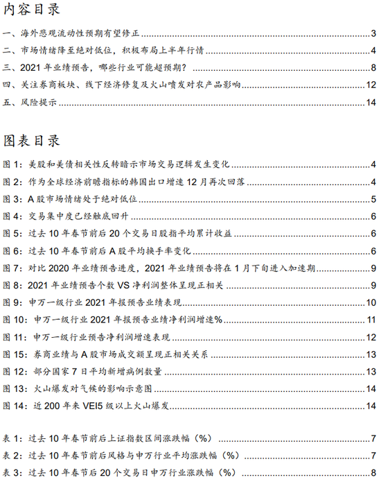 上半年市场低点可能已经出现。本周市场延续调整,尤其是在货币政策落地后,市场反映出更多的担忧情绪,部分投资者对于未来行情转向悲观。从近期市场的种种迹象来看,我们认为上半年市场的低点可能已经出现,站在当下时点,投资者可以逐步对于市场转向乐观,积极布局上半年行情。
