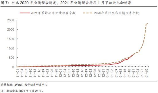 根据2020年报业绩披露进度,2021年业绩预告即将进入冲刺期。截至1月21日收盘,已经公布的2021年业绩预告上市公司个数已经超过660家,相比前一周数量接近翻倍。根据主板、创业板和科创板的披露规则,1月31日将是年报业绩预告的截止期。从2020年的年报业绩预告披露的情况来看,有近70%的公司在最后10天内进行披露,年前最后一周将是上市公司披露业绩预告的加速期。2021年报业绩预告截止1月21日仅有600余家披露,因此对照来看,后续披露斜率将会进一步陡峭,对2021年业绩的指引也将进一步清晰。