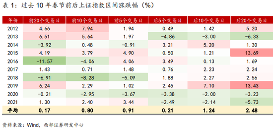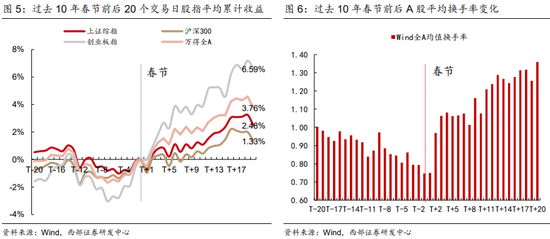 从历史经验来看,春节后的A股市场回暖将是大概率事件。2012-2021年,上证指数在春节前后一周平均涨跌幅分别为0.91%与0.21%,而在春节前后20个交易日平均涨跌幅分别为0.17%与2.48%,节后市场上涨的概率达到了70%。创业板指在春节前后一周平均涨跌幅分别为3.41%与2.28%,而在春节前后20个交易日平均涨跌幅分别为2.95%与6.59%,节后市场上涨的概率同样为70%。与此同时,在节后流动性改善和经济政策预期出台的背景下市场活跃度往往转暖,2012-2021年春节后市场日均成交量与换手率较节前明显上升。