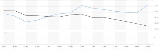 截至1月20日,2022年MSCI China Index上涨了3.85%,标普500指数同期下跌5.95%。