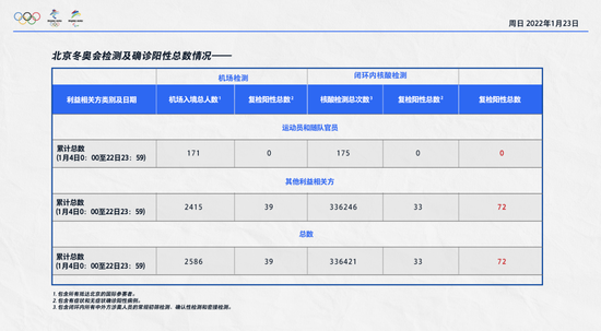 1月4日0:00至22日23:59,闭环内核酸检测总次数336421,其中运动员及随队官员175,其他利益相关方336246。复检阳性33人,均来自其他利益相关方。