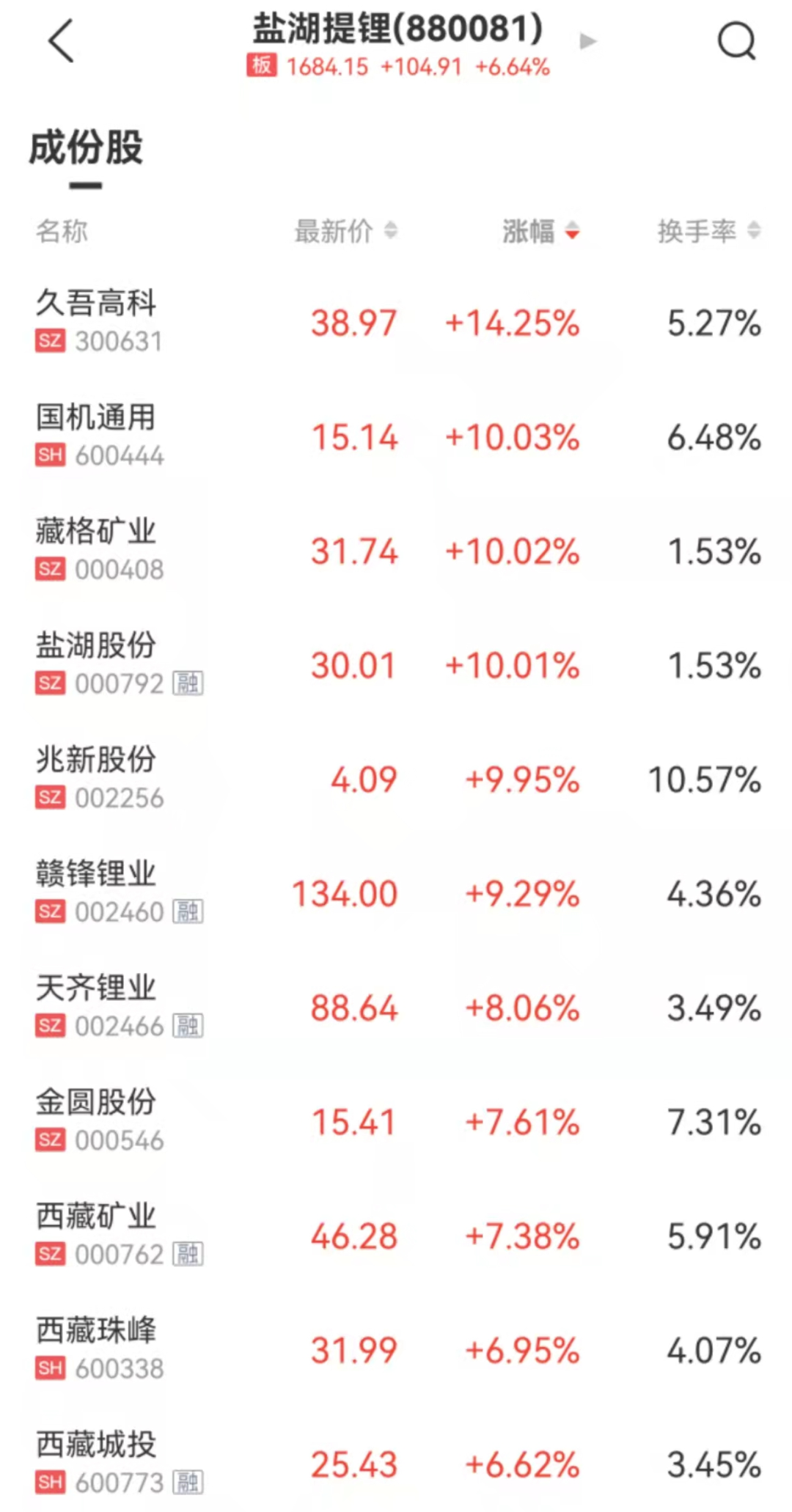 据中证金牛座数据,盐湖提锂概念板块早盘冲高,午间收盘时领涨A股概念板块。板块内,盐湖股份临近午间收盘时涨停,最新总市值为1629亿元;随后国机通用、兆新股份、藏格矿业(维权)迅速拉涨停;久吾高科、赣锋锂业、天齐锂业纷纷大涨。