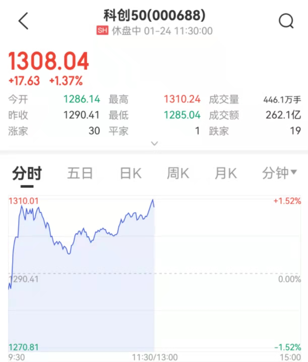在科技股涨势推动下,科创50指数强势上涨,午间收盘时涨幅为1.37%。