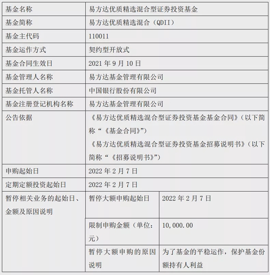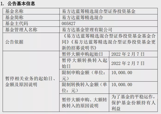 比如易方达张坤管理的易方达蓝筹精选混合,此前单日单账户限额为2000元,从2022年2月7日起单日单账户限额调整为1万元,原来暂停申购的易方达优质精选混合,自2022年2月7日起,单日单账户的限额调整为1万元。