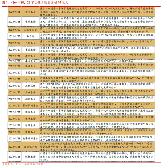 一、近期公募基金积极自购,公告自购规模超14亿元。2022年初以来,受海外央行鹰派转向、变异病毒扩散等影响,全球股市波动加剧,A股亦出现阶段性调整。尤其春节前一周,A股两市股指加速下跌,上证综指跌破3400点,创业板指跌破3000点。尽管近期市场风险偏好低迷,但基于对A股市场长期稳定发展的信心,多家公募基金公告以自有资金申购旗下基金。仅1月26日至1月28日三天,就有22家公募基金公告自购,规模超14亿元。此外,近期睿远基金、易方达基金、富国基金旗下多只热门基金产品逐步放开申购限制。