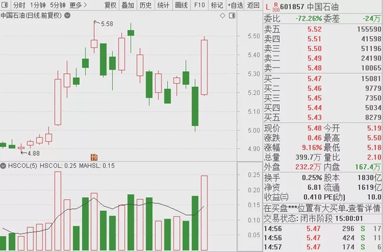 今天,沪市走得较强,主要功劳是中国石油、中国石化等油气板块大涨,这与国际油价走高有关。