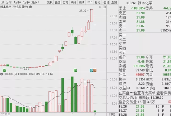从今天的跌幅榜来看,曾暴涨4倍的大牛股雅本化学(维权)被闷杀了,开盘就是一字跌停,截至收盘,封单63万手。