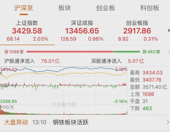 在油气、锂电、煤炭、水泥、基建等周期板块拉动下,A股早盘高开高走,迎来虎年首日开门红行情,投资者开心收下红包,但从回落走势来看情绪并不高。沪指全天震荡上涨,最后收跌2.03%报3429.58点;创业板指士气并没有一路高涨,盘中涨幅最高达2.7%,之后大回调,尾盘一度翻绿,最后收涨0.31%报2917.86点。