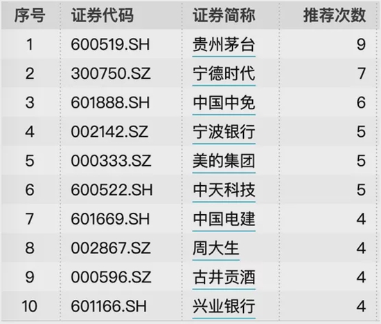 Wind月度热门推荐金股数据显示,贵州茅台(600519.SH)被券商推荐9次,宁德时代(300750.SZ)和中国中免(601888.SH)分别被推荐7次和6次。