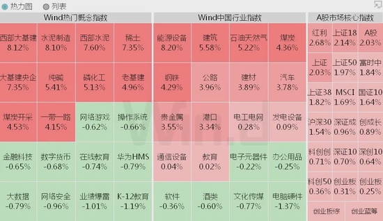 盘面上,油气、水泥、大基建央企、建筑、钢铁、煤炭板等板块集体躁动,数家中字头大基建股封板。金融、地产和银行也表现尚可。