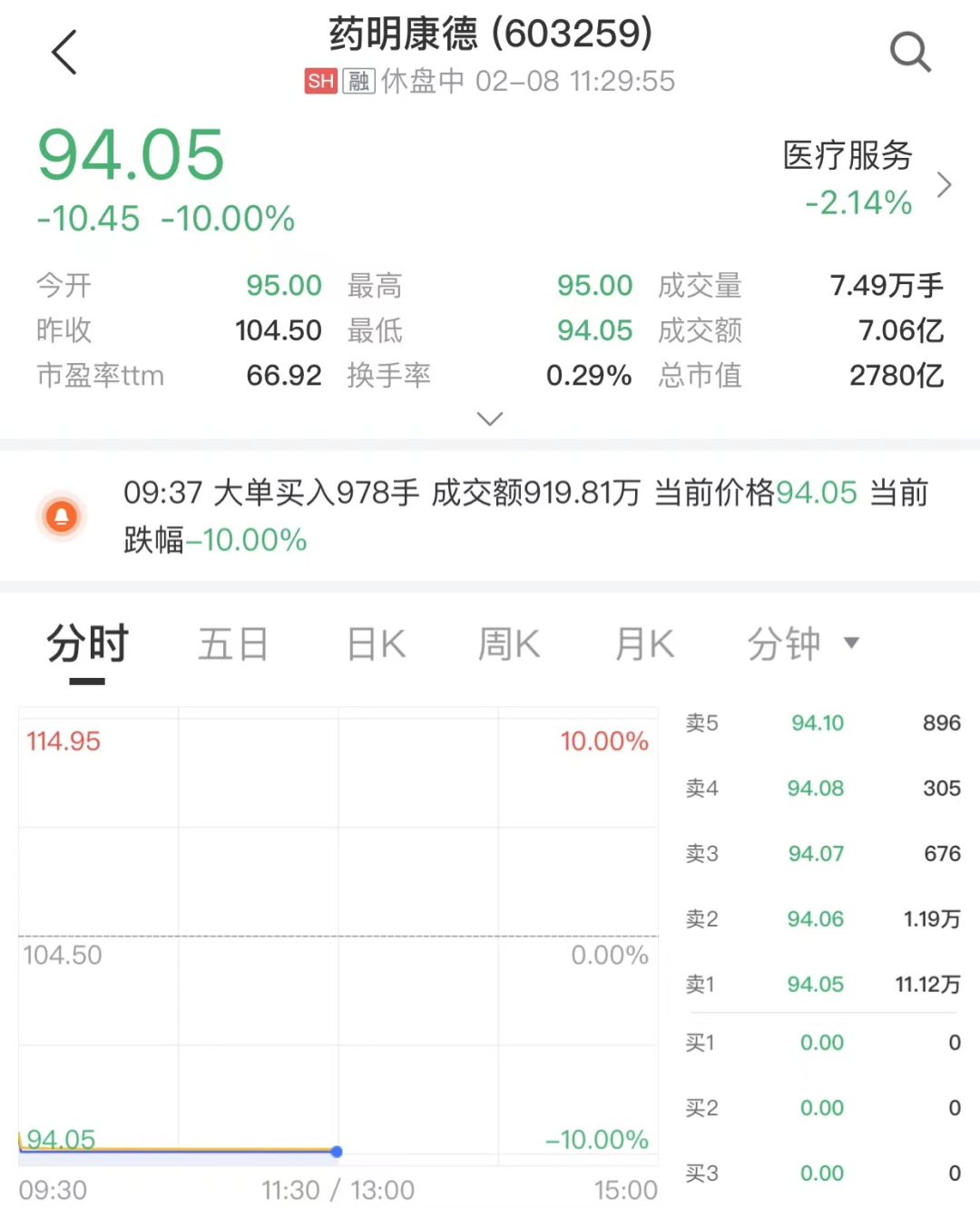 截至午间收盘,药明康德A股跌停,跌停板上的封单为11.12万手,成交额为7.06亿元,市值蒸发约309亿元,药明康德港股下跌15.10%。