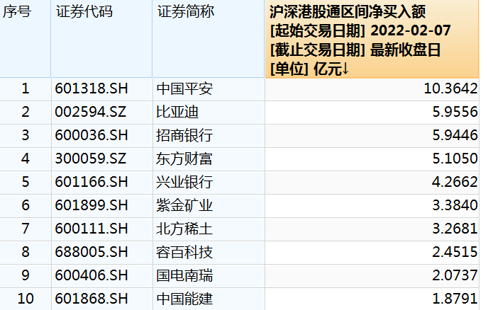 北向资金2月7日加仓居前的股票分别为中国平安、比亚迪、招商银行、东方财富、兴业银行,加仓金额分别为10.36亿元、5.96亿元、5.94亿元、5.11亿元、4.27亿元。