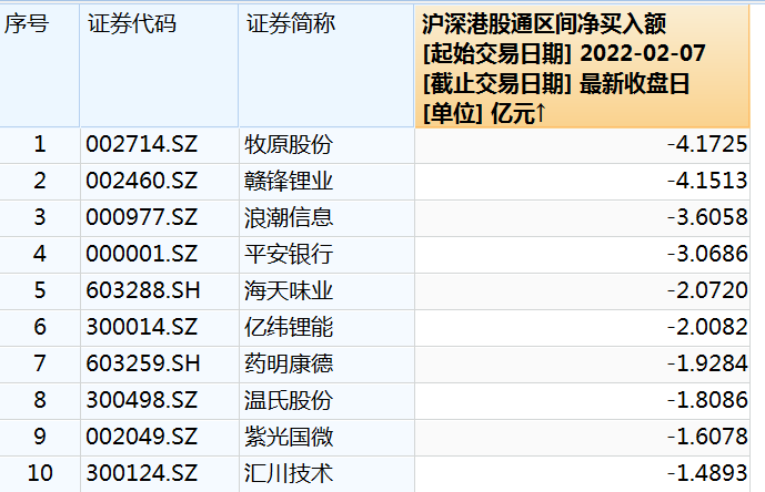 减仓居前的股票分别为牧原股份、赣锋锂业、浪潮信息、平安银行、海天味业,减仓金额分别为4.17亿元、4.15亿元、3.61亿元、3.07亿元、2.07亿元。