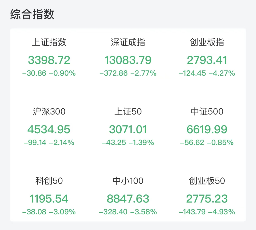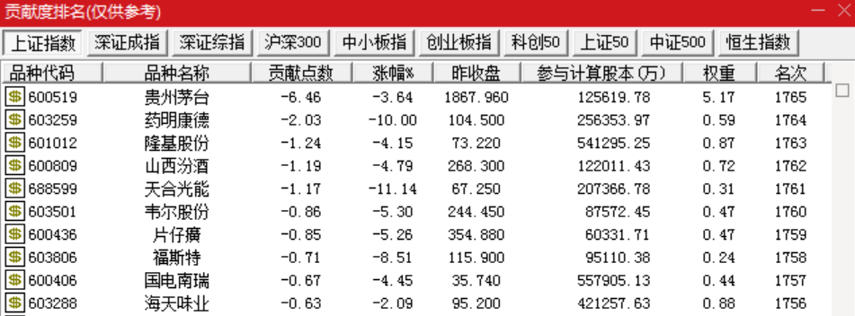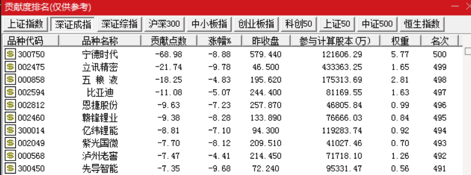 而深证成指的下跌主要由宁德时代、立讯精密、五粮液、比亚迪等带动。上证指数的下跌则由贵州茅台、药明康德、隆基股份等带动。
