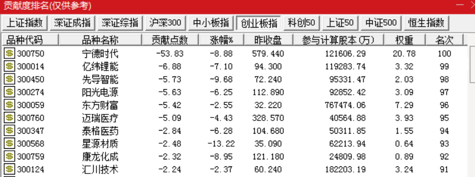 数据显示,以贵州茅台、药明康德(维权)、宁德时代为首的一批权重股下跌。从对创业板指数贡献度来看,宁德时代大跌8.88%,半日市值蒸发约1200亿元,对创业板指的贡献点达-53.83点,占创业板指下跌点数的4成以上。此外亿纬锂能、先导智能、阳光电源、东方财富等创业板权重股的下跌也助力创业板指的下跌。
