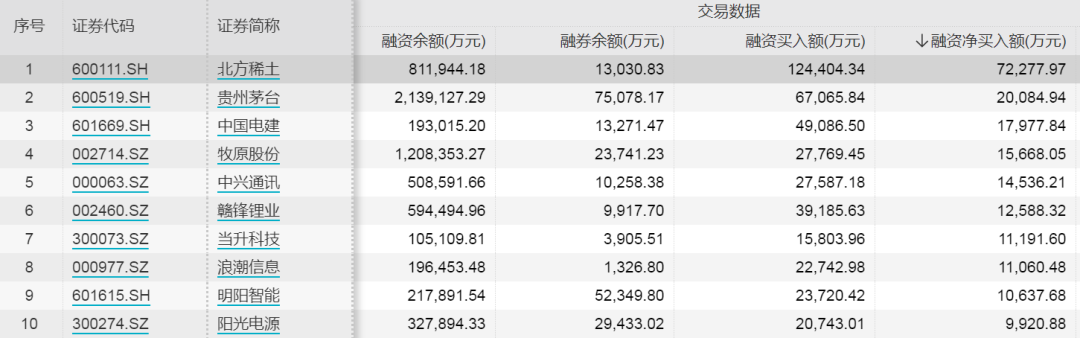 从2月7日融资净买入金额居前的股票来看,北方稀土、贵州茅台、中国电建、牧原股份、中兴通讯融资净买入金额居前,分别净买入7.23亿元、2.01亿元、1.80亿元、1.57亿元、1.45亿元。