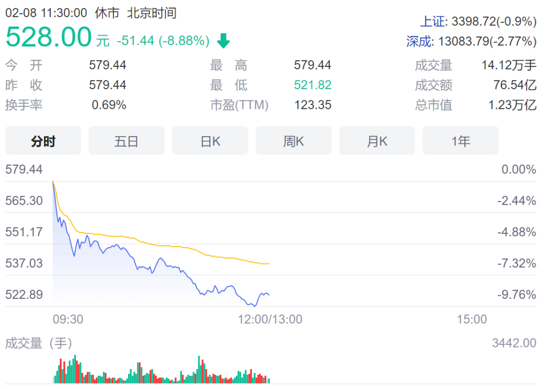 “宁王"早盘罕见跌近10%。截至收盘,收跌8.88%,股价跌至528元每股,市值蒸发近1200亿至1.23万亿元。交易额达到76亿。