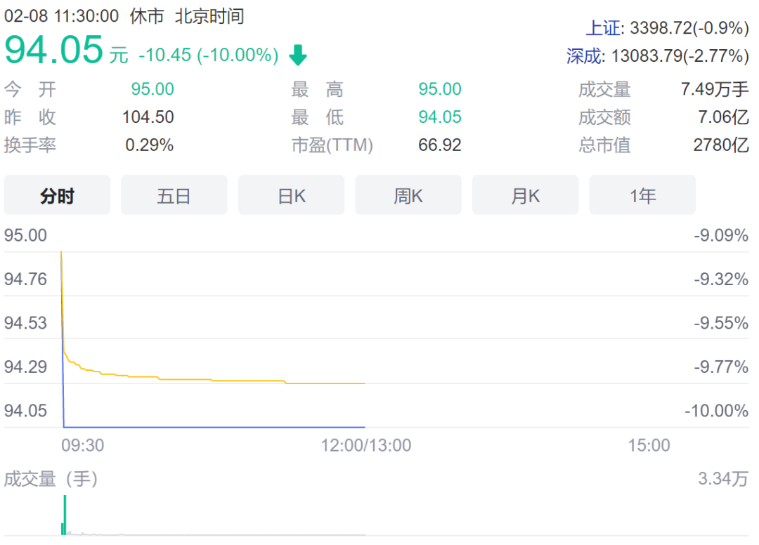 A股上市的药明康德开盘闪崩跌停,最新股价94.05元每股,市值2701亿元。