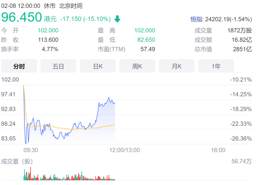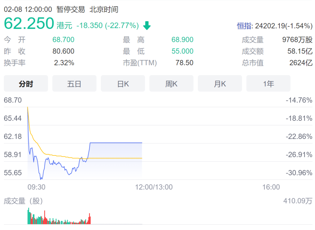 在港股上市的药明生物一度跌超30%,随后在接近11点时暂停交易,停牌前股价跌近23%,股价为62.25港元,市值2624亿港元。