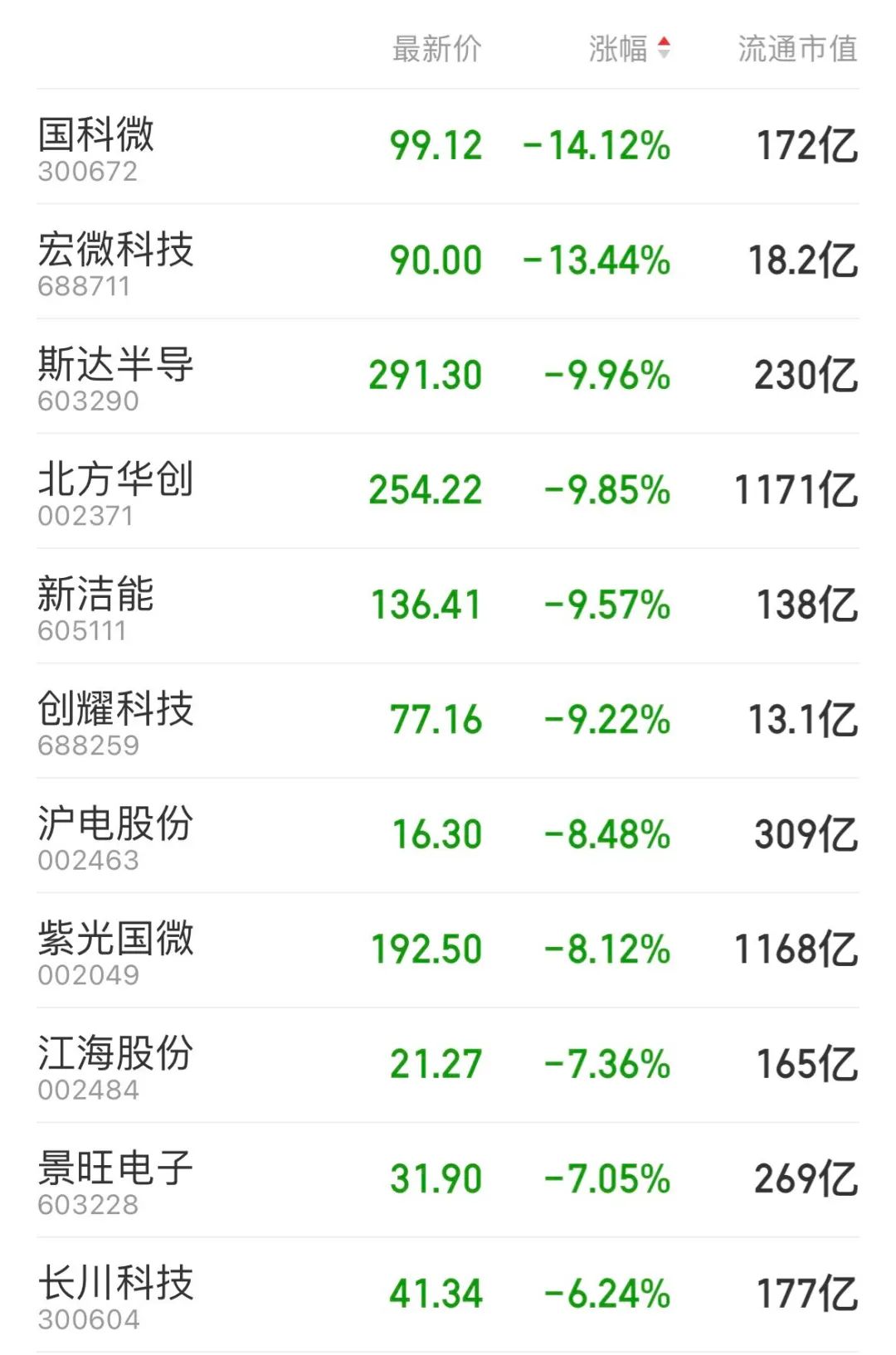 各大板块龙头集体重挫。千亿芯片龙头北方华创跌近10%。