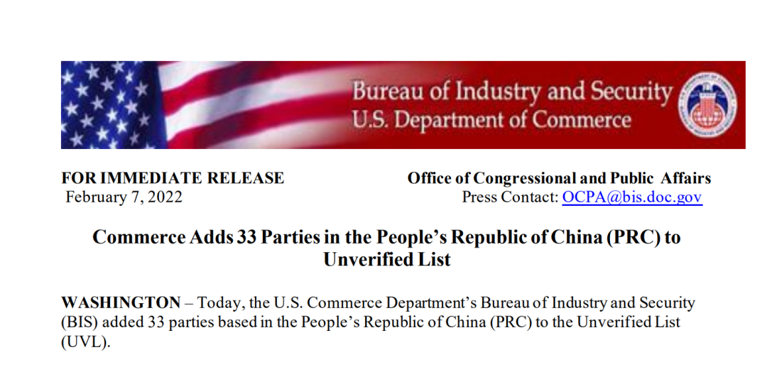 据环球网援引美国媒体消息,当地时间2月7日,拜登政府将33家中国实体列入商务部的“未经核实名单”(Unverified List),对这些实体从美国出口商获取产品实施新的限制,并要求希望与这些中国公司做生意的美国公司进行额外的调查。