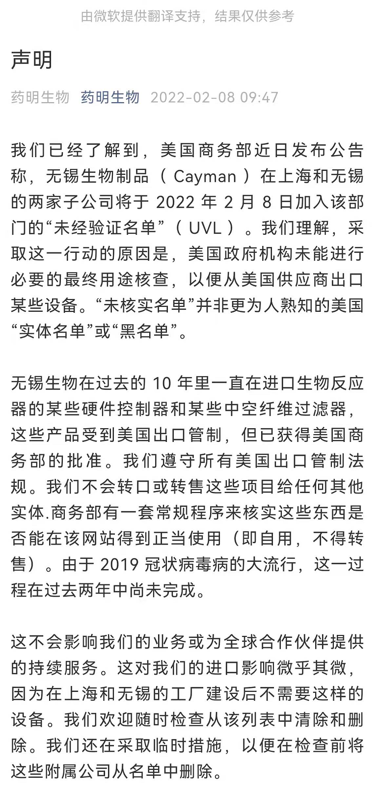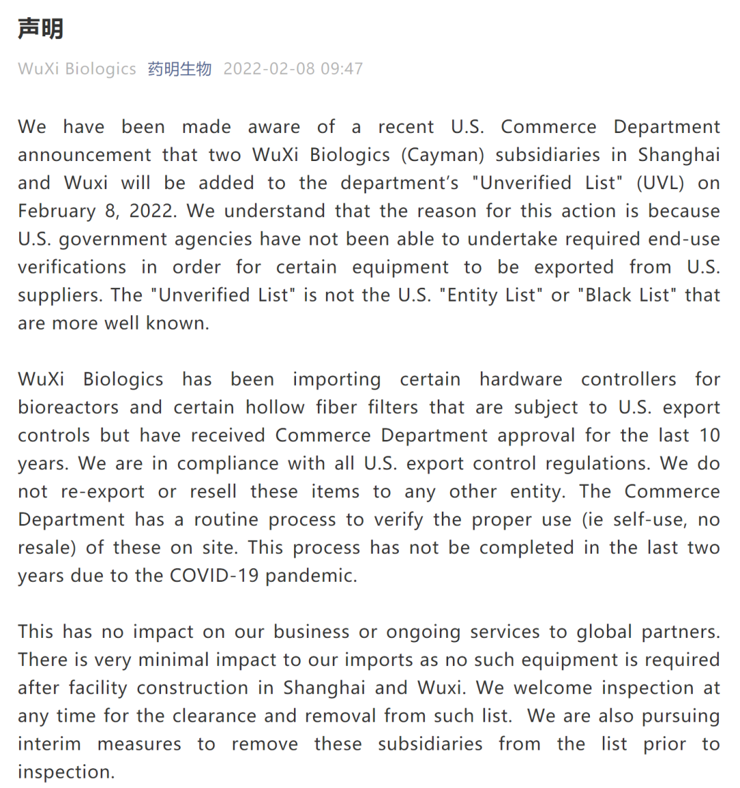 药明生物回应被纳入美国商务部“未经核实名单”称:我们理解,采取这一行动的原因是,美国政府机构未能进行必要的最终用途核查,以便从美国供应商出口某些设备。“未核实名单”并非更为人熟知的美国“实体名单’或“黑名单”。