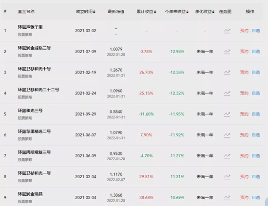 值得注意的是,私募排排网的数据显示,上海环懿私募基金旗下合计有13只产品,其中大多数今年以来亏损10%以上。比如环懿卫杉和光二十二号截至今年1月31日的单位净值为1.096,今年以来亏损12.32%,该产品成立未满一年,产品区间最大回撤超18%。此外,环懿卫杉和光十号截至1月31日的单位净值为1.267元,该产品同样成立未满一年,今年以来亏损12.38%,产品区间最大回撤超18%。