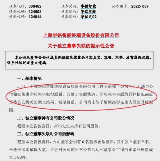 而华铭智能也在2月8日发布了关于独立董事失联的提示性公告称,公司无法与公司独立董事高杉先生取得联系,其处于失联状态,高杉先生失联的具体情况尚需等待公安机关的调查结果。截至目前,公司尚未能了解到高杉先生失联的具体原因。