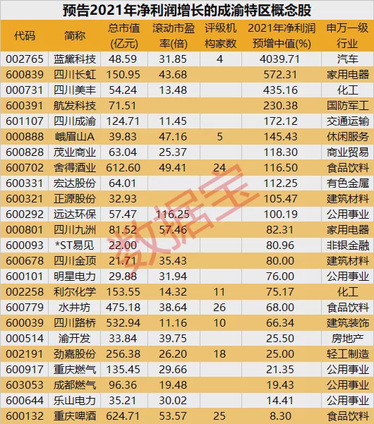 证券时报·数据宝整理了预告2021年净利润增长的成渝特区概念股名单。以预告区间中值计算,11股净利润有望翻倍。蓝黛科技以40.4倍的增幅一骑绝尘,报告期内,公司主营的触控显示业务和动力传动业务较好发展,从而带动公司整体业绩大幅增长。四川长虹、四川美丰、航发科技等3股业绩增幅靠前。