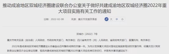 2月8日,重庆市发展改革委发布《关于推动成渝地区双城经济圈建设联合办公室关于做好共建成渝地区双城经济圈2022年重大项目实施有关工作的通知》,共建成渝地区双城经济圈2022年重大项目共160个,估算总投资约20367亿元,年度计划完成投资1835亿元。