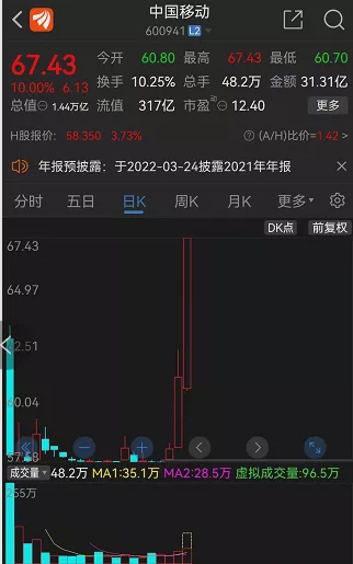 2月,中金给予中国移动A股跑赢大盘的初始评级,目标价81元,对应13.8倍2022年P/E。