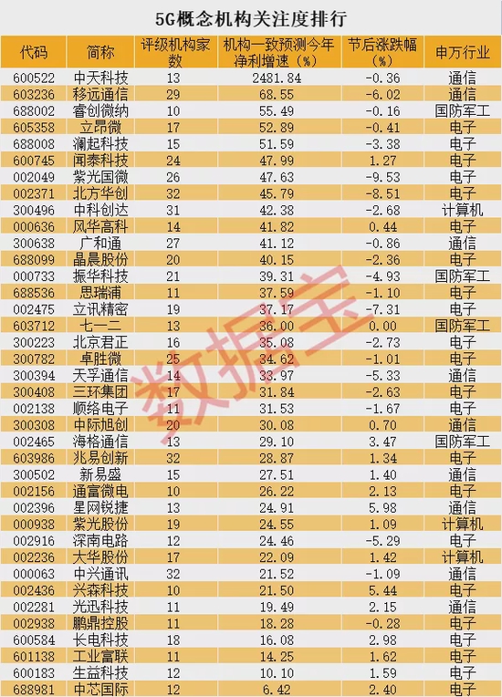 A股5G概念股合计有120多只。其中,评级机构数在10家以上的个股合计有30多只个股。具体来看,中兴通讯、兆易创新、北方华创等个股均有30多家机构评级,移远通信、广和通、紫光国微等个股均有20多家机构评级。