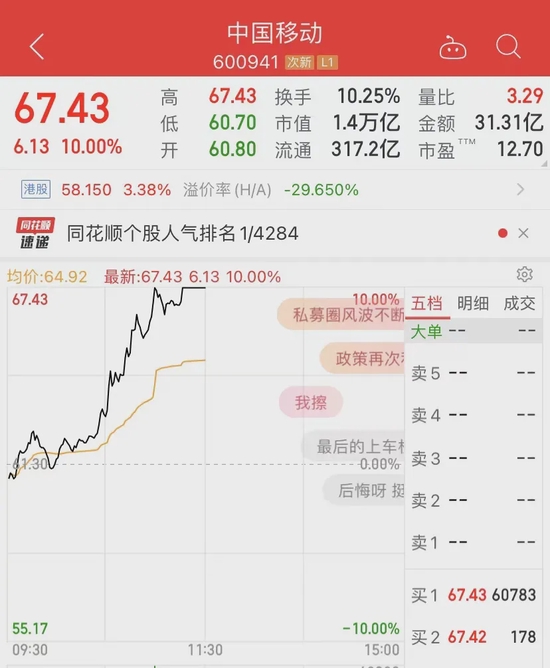 次新股的1万多亿元市值的电信运营巨头中国移动,突发涨停,股价创出历史新高,市值高达1.44万亿元。
