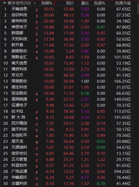 央行等研究制定法定数字货币信息安全标准,数字货币概念股今天上午疯涨,板块涨幅高达7.98%,个股掀起涨停潮,多只个股20cm涨停。