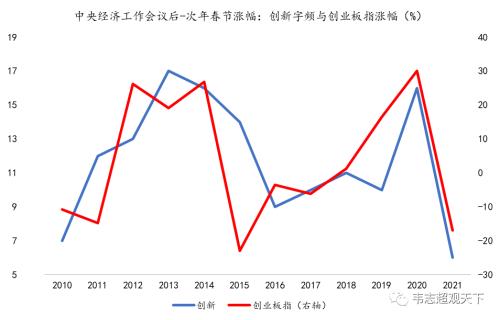 从历史数据的规律来看,中央经济工作会议关于创新的词频与会议之后两个月内创业板的涨幅密切相关。过去几年科技特别是硬科技打入了很高的估值,在政策变化的情况下股价很容易发生变化。