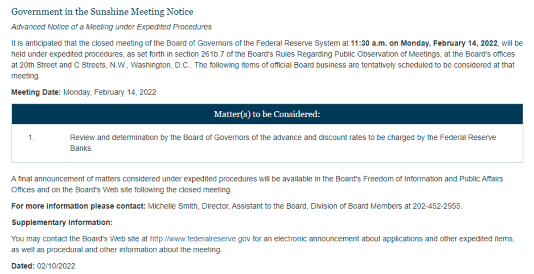 通知指出,预计美联储理事会于当地时间2月14日星期一上午11:30举行的非公开会议。该会议将在华盛顿特区西北20街和C街的董事会办公室举行。暂定在该次会议上审议项目为:由理事会审查和确定联邦储备银行收取的预付款和贴现率。闭门会议结束后,联储网站上将公布根据快速程序审议的事项的最终公告。此举被市场解读为美联储紧急加息的信号。全球股市因此全线杀跌,美股期指跌幅一度皆逼近1%,亚太市场亦多数走低。