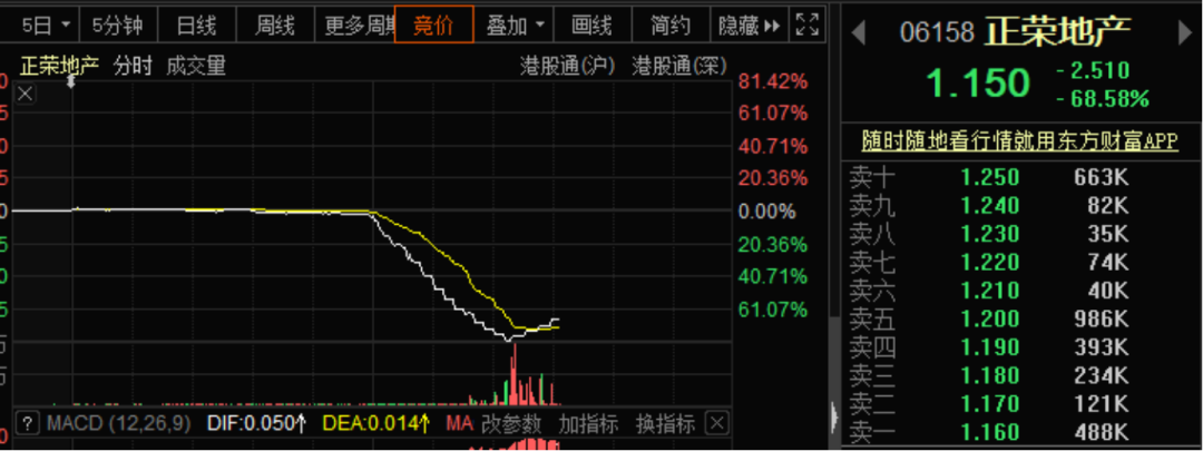 2月11日午后,市值近160亿港元的正荣地产突然暴跌80%,续创纪录最大跌幅,盘中曾触发市场调节冷静期机制;其兄弟公司正荣服务亦一度暴跌超85%。