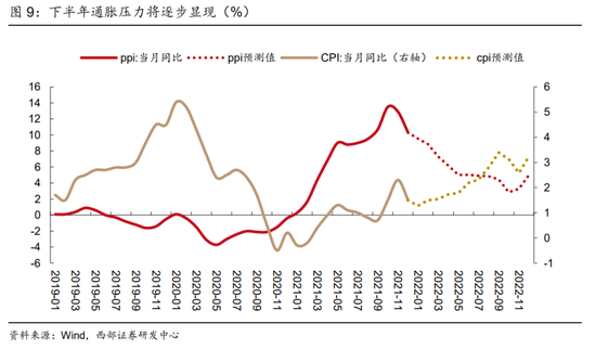 宽信用仍然是上半年最确定的宏观环境。依据西部宏观团队预测,2022年社融年内高点或为11.5%,年底增速有望达到10.7%。在《天量社融回应稳增长质疑》报告中,西部宏观团队认为2022年社融新增规模有望达到33.5万亿,2022年底社融余额同比增速有望达到10.7%的水平。社融口径的人民币贷款有望在2022年达到全年22万亿左右的水平,比2021年的19.95万亿,同比多增2万亿左右。根据今年财政前置的特点,社融同比增速高点在三季度左右出现,增速有望录得11.5%的水平。