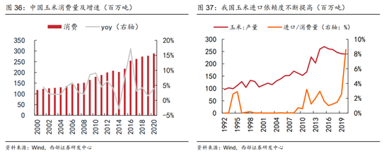 近年来我国玉米消费量不断提高,进口依赖度也在攀升,玉米种业安全值得关注。主粮方面,我国玉米种子也在一定程度上存在对进口的依赖。根据海关总署数据,2019年我国玉米种子进出口贸易逆差达185万美元,进口依赖度相对有限。然而当前我国玉米消费量不断提高,2020年我国玉米消费量高达2.89亿吨,进口依赖度也进一步提升至9%。在玉米饲料和燃料乙醇需求持续增加的带动下,长期来看玉米的产需缺口将进一步拉大,部分依赖于外资进口的玉米种业安全将愈发值得关注。