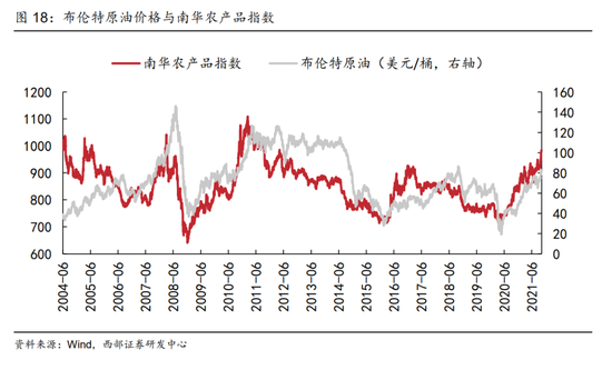 大宗商品价格上涨对于必须消费品的价格传导将是最具确定性方向。虽然受制于需求偏弱,大宗商品价格上涨最快的阶段可能已经过去,但是考虑到供给恢复的迟缓,以及供应链紧张催生的预防性补库需求的增加,以原油为代表的工业品价格仍将维持在较高水平。从历史上来看,原油价格上涨对农产品价格有着较为显著的传导,2004年以来布伦特原油价格在2007年、2010年、2016年和今年的快速上行均显著推高了南华农产品指数。