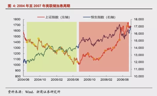 在2004年6月至2007年10月的美联储加息周期中,A股的房地产、金融、材料、能源和日常消费等行业具备比较优势。