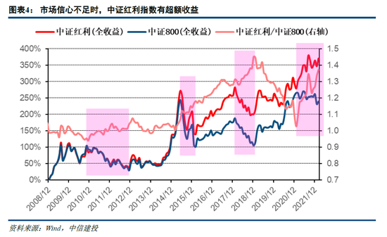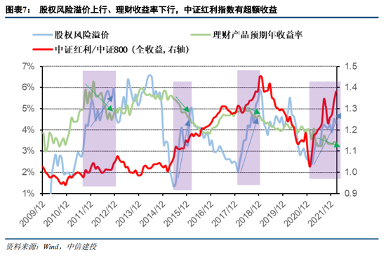 股权风险溢价上行代表股票相对债券的投资性价比上升,但此时股票市场往往也处于下跌中,叠加理财产品收益率下行的情况时,投资者更倾向于将资金配置于高股息、低风险标的(如2012年、2015下半年、2018年、2021年)。这样可以在有稳定且可观的股息收益作为安全垫的基础上,在左侧逐步布局权益类资产,在未来股市回暖后获得更多的投资收益。