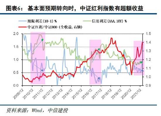 当经济前景不确定性较大、市场基本面预期转向时,高股息标的企业盈利本身波动相对较小,并且可能额外受到稳增长政策的支持。期限利差反映投资者对未来经济的预期,信用利差反应市场的融资环境。当期限利差缩窄、信用利差走阔时,市场风险偏好下行,经营稳健并且具备稳定分红的资产将会受到投资者的青睐。此外信用利差上升往往也意味着企业融资成本上升,有利于银行板块,从而也有利于银行占较大权重的中证红利指数。