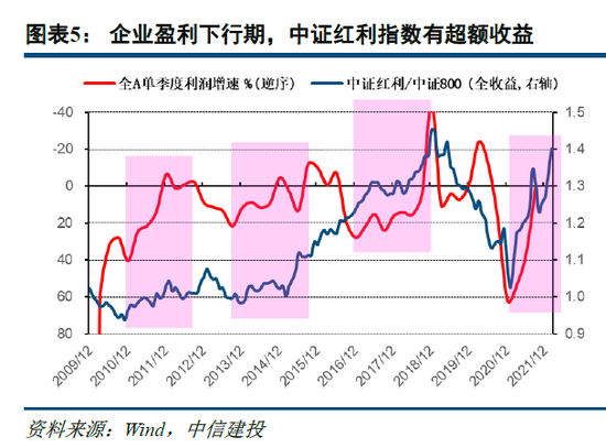 当经济前景不确定性较大、市场基本面预期转向时,以银行股、公用事业股、周期资源股龙头等为主要构成的大市值高股息标的,企业盈利本身波动相对较小,并且可能额外受到稳增长政策的支持。