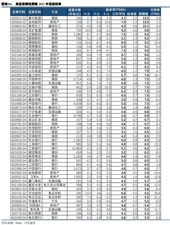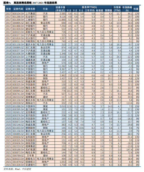 我们构建了高股息精选策略,首先计算各上市公司当年预期股息率(一致预期净利润*过去三年平均分红比例/总股本/年初股价,对于无一致预期数据的公司,则采用最新一期净利润(TTM)作为替代),然后综合考虑公司的市值水平、分红持续性、分红稳定性以及现金水平等,在金融地产、公用事业、日常消费以及周期板块中进行如下筛选: