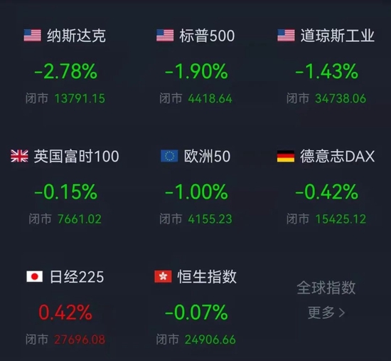周五,美国三大股指全线收跌,道指跌1.43%报34738.06点,标普500指数跌1.9%报4418.64点,该指数两天累计下跌3.7%,创2020年10月以来最大两日跌幅,纳指跌2.78%报13791.15点。本周,道指跌1.0%,标普500指数跌1.82%,纳指跌2.18%。