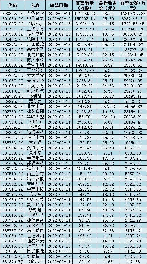 值得关注的是,下周将有49只股票面临解禁,合计解禁量为51.4亿股,按最新收盘价计算,合计解禁市值为2503.6亿元。具体看,万华化学解禁规模居首,解禁市值达1684亿元,紧随其后的是中信证券、福莱特、立华股份等个股解禁金额均超100亿元。