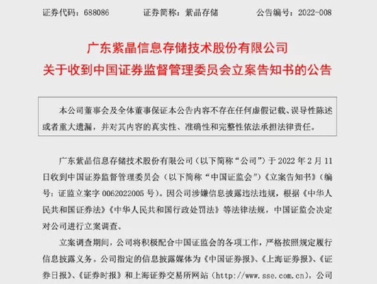 2月11日晚间,紫晶存储公告称,公司当日收到中国证监会立案告知书。因公司涉嫌信息披露违法违规,根据《中华人民共和国证券法》《中华人民共和国行政处罚法》等法律法规,中国证监会决定对公司进行立案调查。