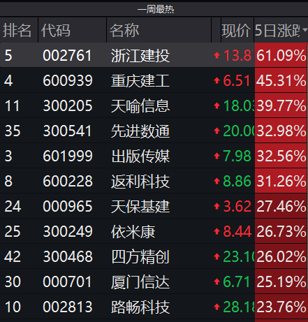 Wind统计显示,基建工程指数上周涨7.06%、交通运输(申万)指数上周涨5.44%、房地产(申万)上周涨4%。热门股票中,如浙江建投、重庆建工、天保基建等,近五日涨幅均超过20%,其中浙江建投近五日涨幅超过61%,2月14日开盘即一字封板涨停。